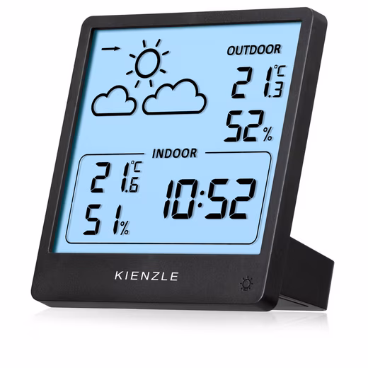 The KIENZLE Slim wireless weather station impresses with its stylish combination of sleek design and high functionality. The clear display shows precise indoor and outdoor temperature and humidity readings . The weather station also provides a reliable forecast with a practical trend indicator . And, of course, the time is also displayed – a feature not found on a device from Germany’s oldest watch brand. Comprehensive measurement functions : The integrated thermo-hygrometer reliably records the current indoor temperature and humidity. Outdoor measurements are taken by the wireless sensor, which transmits the outdoor temperature and humidity readings to the weather station’s sleek display within a range of up to 60 meters. Accurate weather forecast: Enjoy a trustworthy weather forecast with a practical trend indicator. Calibration is quick and easy: simply compare the readings with the current outdoor weather and adjust them in a flash. The weather forecast is then reliably calculated based on air pressure fluctuations. Practical additional functions: The weather station with outdoor sensor stores the maximum and minimum readings, allowing you to track temperature and humidity trends at the touch of a button. The display also features touch-activated backlighting – ideal for use day and night. Discover the KIENZLE Slim wireless weather station , a stylish weather measuring device that blends seamlessly into any environment. FEATURES BASE STATION