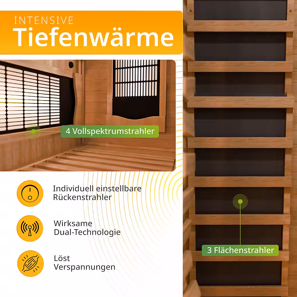 - Dual technology: 4 full-spectrum radiators for intense deep heat; 3 panel radiators for a comfortable room temperature.