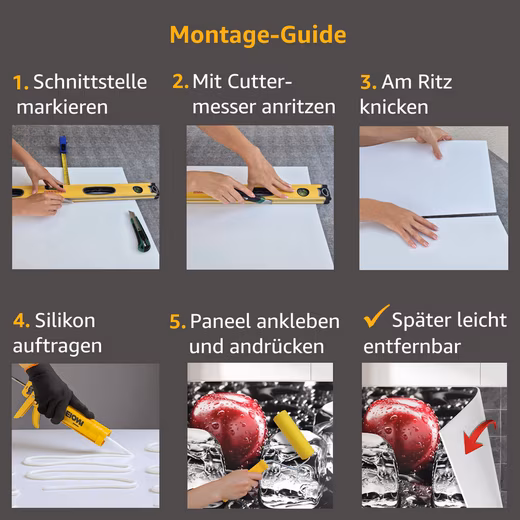 - Durable: scratch-resistant, water-, UV- and heat-resistant (except for gas stoves). Reliably bridges gaps, material thickness: 1.6 mm.