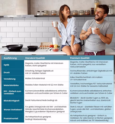 For optimal results, it is essential to prepare the surface carefully. The area should be free of dust, grease, and moisture to ensure the backsplash adheres properly. Especially when applying it to tiles, it is advisable to press the film down firmly over a large area using a squeegee to prevent it from showing through the grout lines. Do not press the film into the tile grout! After installation, the backsplash should be left to rest for at least 24 hours to allow the adhesive to reach its full bonding strength.