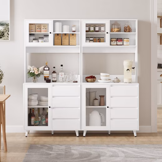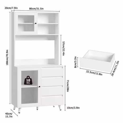 The kitchen sideboard is predominantly white, with glass doors and black handles, creating a sleek and tidy look. The upper section features a cabinet with glass doors on the left and open shelves on the right, perfect for storing small items like spice bottles. In the center is a spacious, open worktop, 56 cm high, easily accommodating appliances such as a coffee maker, toaster, microwave, and more. The 80 x 40 cm work surface provides ample space for use. The lower section offers a larger storage compartment with glass doors on the left and four drawers on the right, allowing you to neatly organize your dishes, cutlery, cookware, cups, and other items. This sideboard can be used as a kitchen cabinet, pantry, or dining room cabinet.