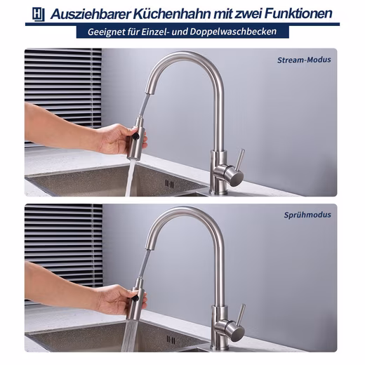 - With pull-out spout: Water where it’s needed – the spout can be extended by 40 cm.