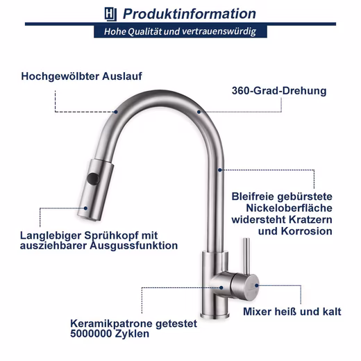 - Elegant design: with its minimalist silhouette and high, arched spout, the faucet crowns the kitchen.