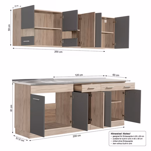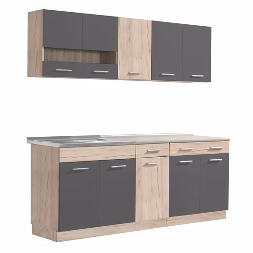 • Modern kitchen unit 200 cm in grey and oak, ideal for small kitchens, apartments or offices, functional and space-saving without electrical appliances