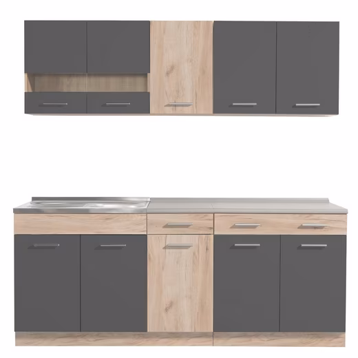This modern fitted kitchen, with its upper and lower cabinets, offers ample storage space for plates, cups, glasses, pots, and much more. Two drawers provide additional storage for cutlery and other cooking utensils. While the base cabinets come with robust and easy-care worktops, the wall cabinets can be individually adjusted to your height. The compact kitchen, with its simple design in subtle gray, blends seamlessly into any home. Decorative elements in a gray oak finish complete the stylish look of the cabinets. At 200 cm wide, this kitchen unit (without appliances) requires minimal space and is therefore also suitable for studio apartments or offices. The kitchen is delivered disassembled and requires assembly. Delivery is by freight carrier (curbside delivery) on a pallet.