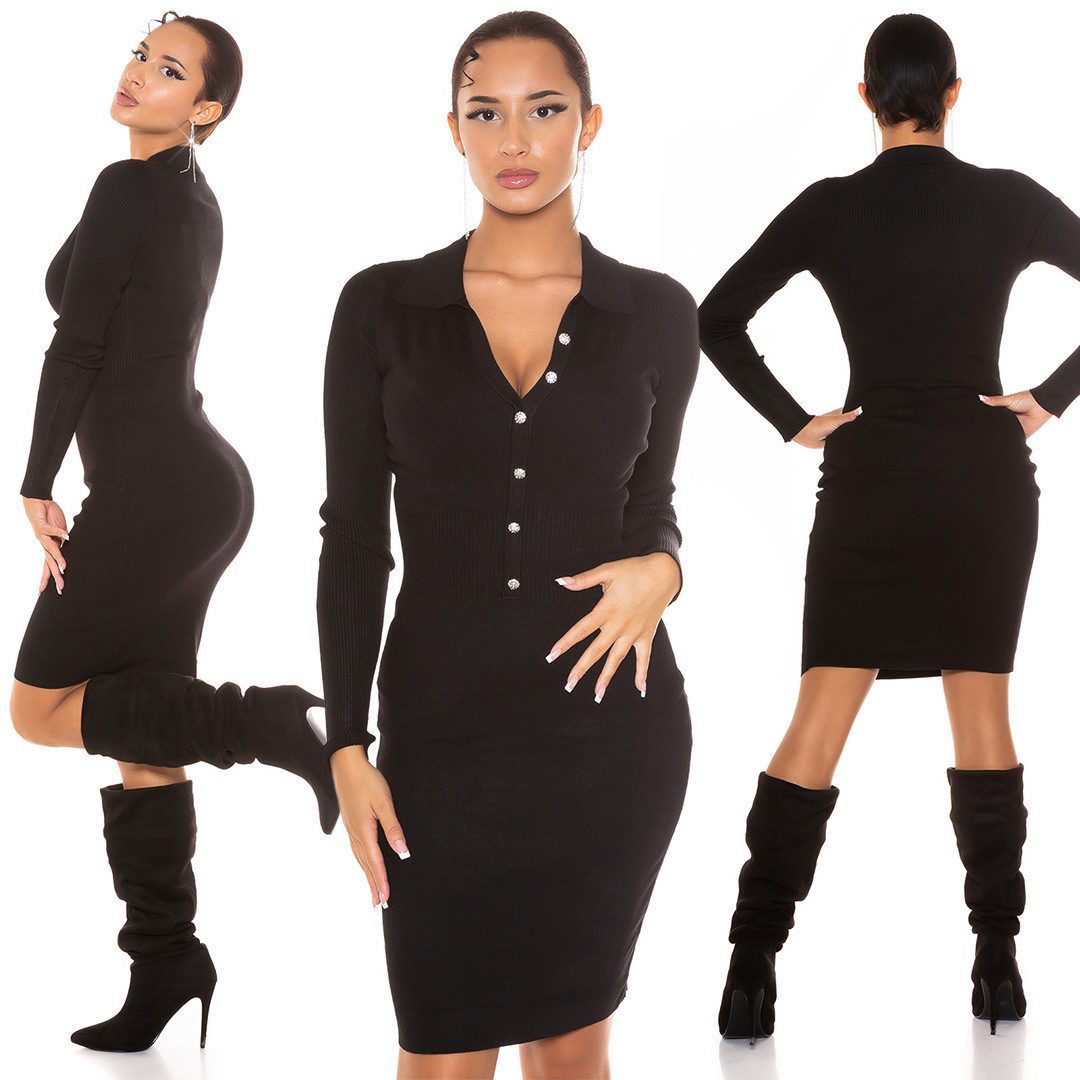 A charming business-style knit dress. Featuring a polo collar, knee-length, and a figure-hugging fit. The highlight is the sparkling rhinestone buttons, which make this dress a real eye-catcher. One size = fits size S.