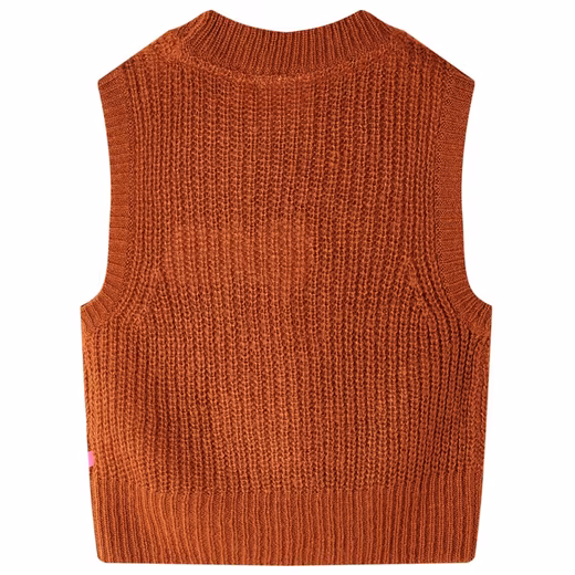 This children’s pullover vest features a round neck and ribbed cuffs at the neckline, armholes, and hem. The children’s pullover vest is knitted from a soft material made of 67% acrylic and 33% viscose, making it very comfortable and warm.