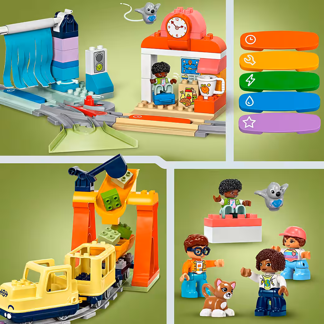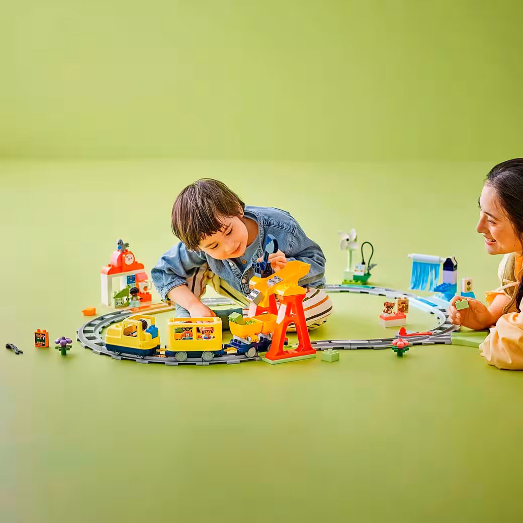 The toddlers’ learning journey begins right at the playset’s station. Preschoolers can invent a route for the push-and-go passenger train and complete exciting tasks along the way. Children can load the toy train with cargo, charge the engine, or wash the passenger cars. When the train passes over one of the five action bricks, each activity is accompanied by lights and sounds. This set also encourages toddlers to develop patience and curiosity as they experiment with new building possibilities for their railway.
