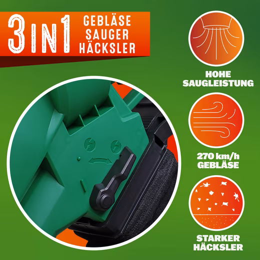 - 3 IN 1 FUNCTION: Leaf vacuum, leaf blower and shredder in one! Clear your garden, terrace and paths of leaves and small branches.