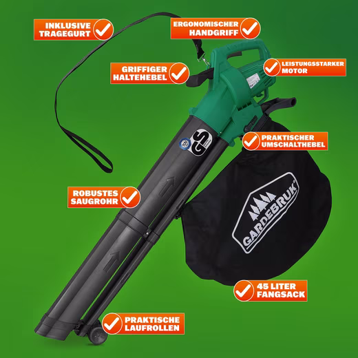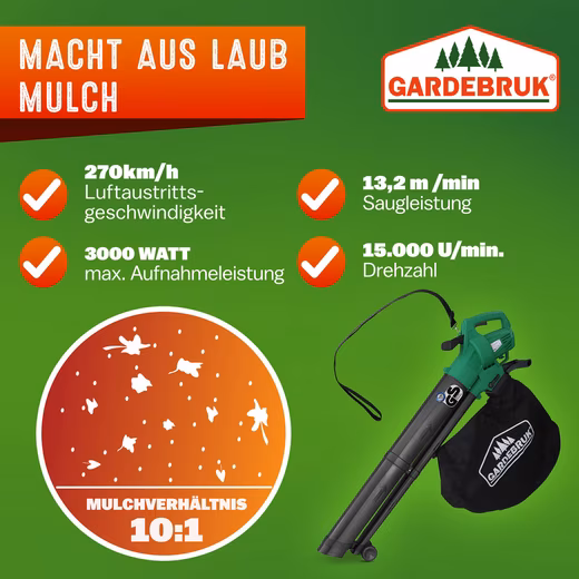 - POWERFUL: Powerful 3,000 watts and an airflow of 270 km/h! The leaves are crushed in a ratio of 10:1. With a large 45 liter collection bag!