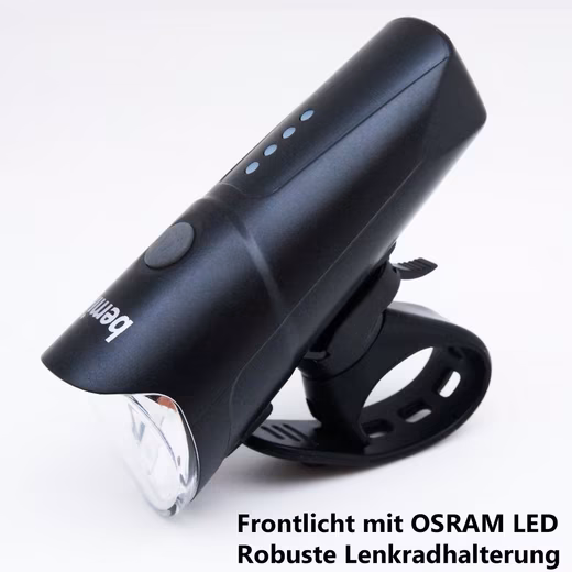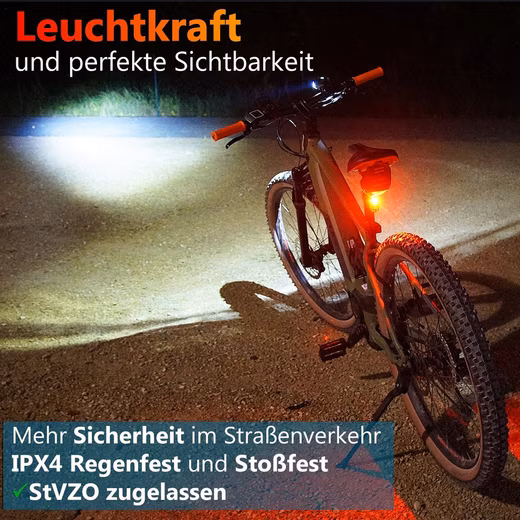 High-performance LED rechargeable bicycle light set with German road traffic regulations (StVZO) approval from bemiX. Rechargeable via USB! The front light with 60 lux and OSRAM LED can be adjusted to three different brightness levels (60 lux/30 lux/15 lux) at the touch of a button, allowing you to conserve battery power when full brightness isn’t needed. The bright rear light mounts to the seat post and ensures excellent visibility. Thanks to the special bracket, the light position can be adjusted up and down. Includes USB charging cable and gentle mounting brackets for attaching to the handlebars and seat post. No tools required for installation.