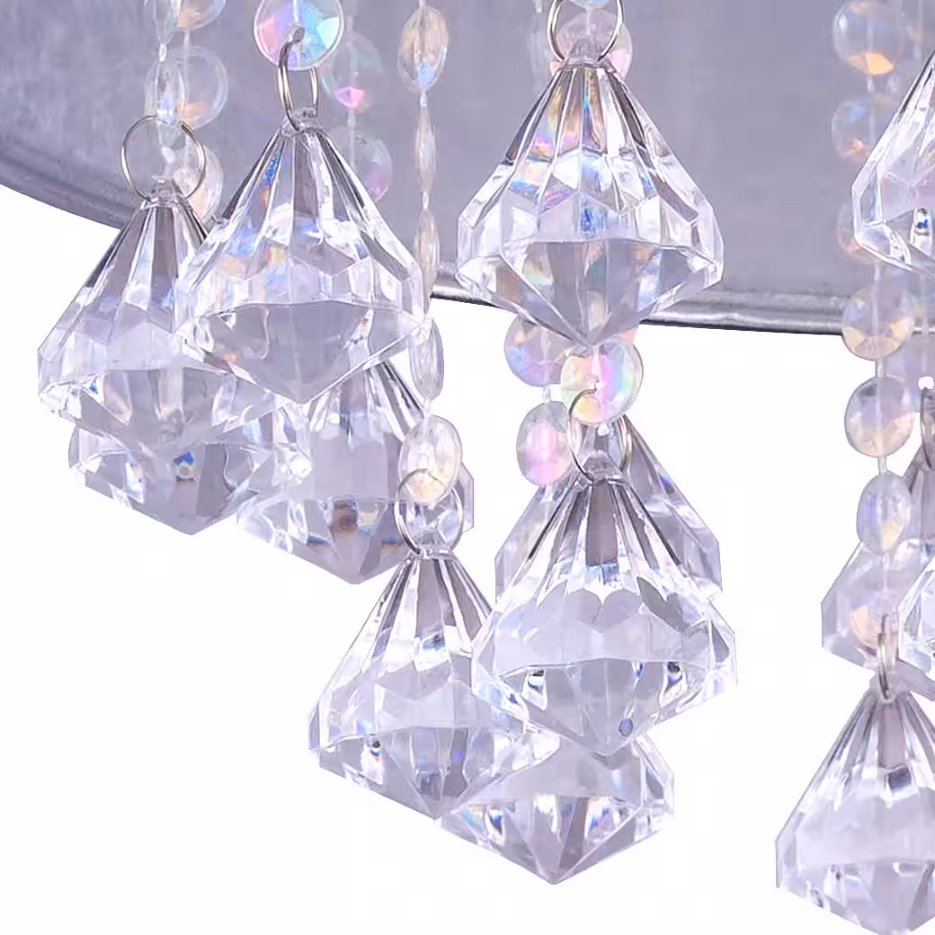 • On the one hand, the hanging, transparent acyl crystals give it a rather playful look, while on the other hand, the circular lampshade, finished in silver leaf, brings out its