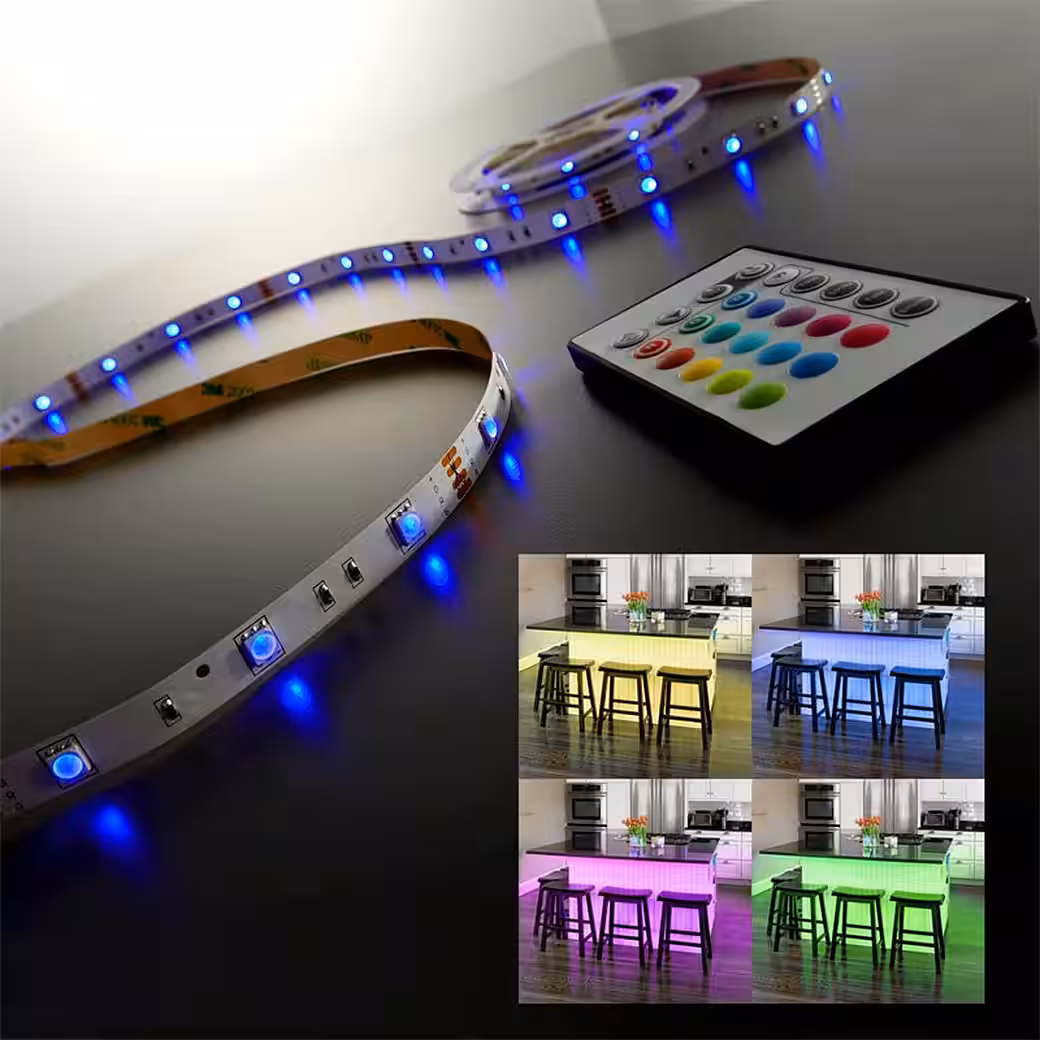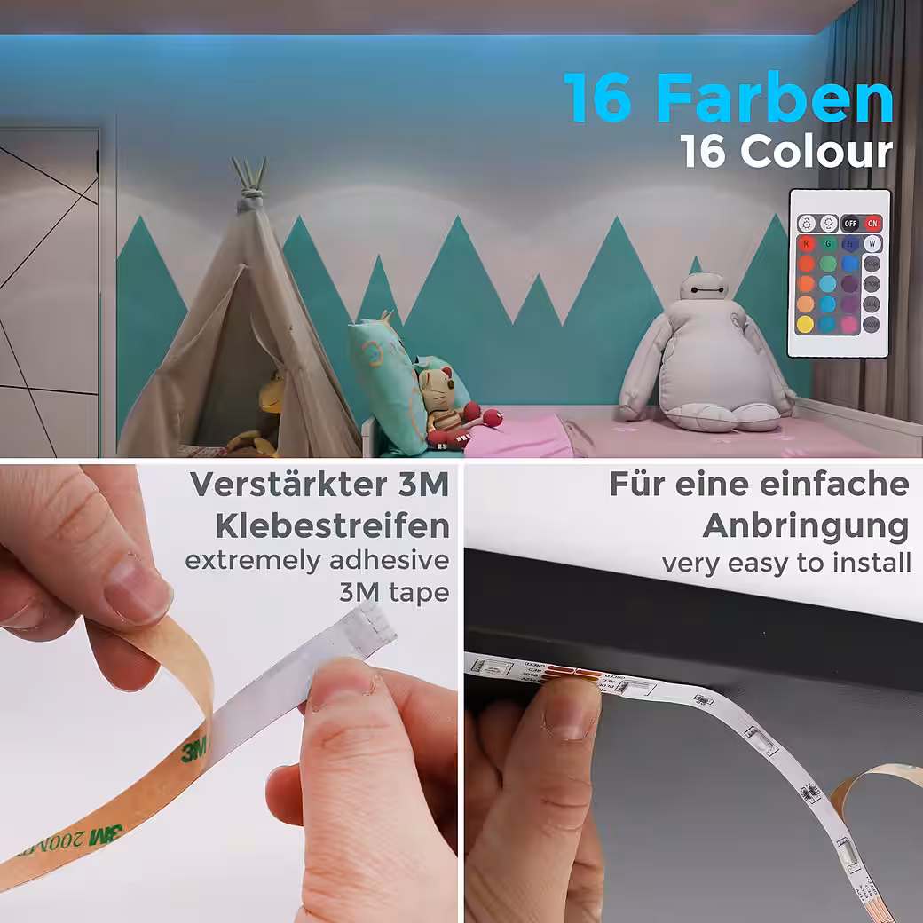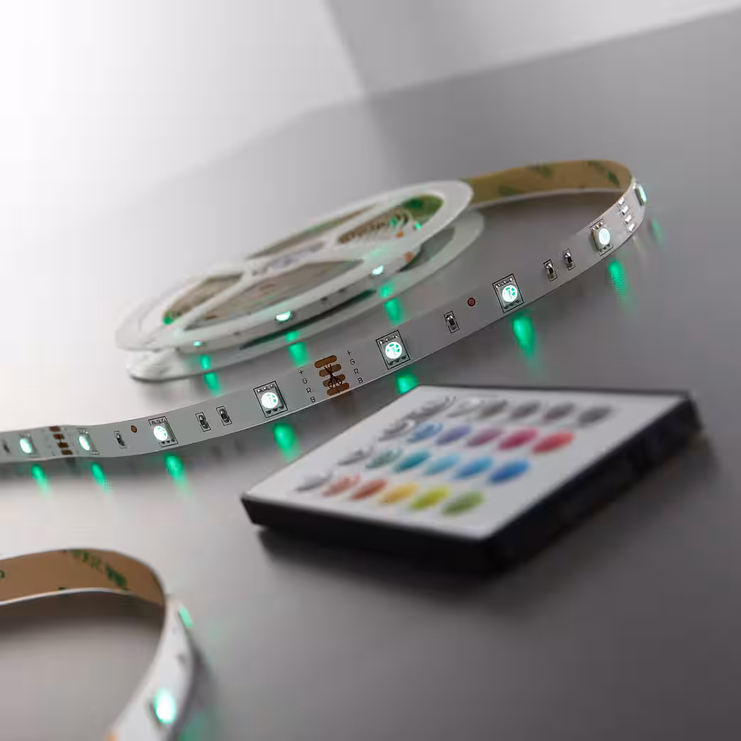 This colorful RGB light strip, with its numerous LEDs, creates a captivating play of light. Thanks to its adhesive backing, Lucilla can be attached to any smooth surface. The included remote control allows you to operate the light from anywhere in the room. Four different modes in 256 different colors ensure the perfect ambiance for any situation. IMPORTANT: The LED strip can only be cut once at the marked points. The cut section is unusable and cannot be rejoined with connectors! The LED light strip contains RGB LEDs. It is easily controlled via remote control. The LED strip is 1 cm wide and 0.3 cm high. It can be cut every 10 cm at the corresponding markings. The LED strip illuminates in a variety of colors. The remote control also allows you to select the desired color. These strips are ideal for creating mood lighting due to their versatility. The RGB LED strips come complete with a power cable and driver. A long lifespan of 20,000 hours promises years of enjoyment.