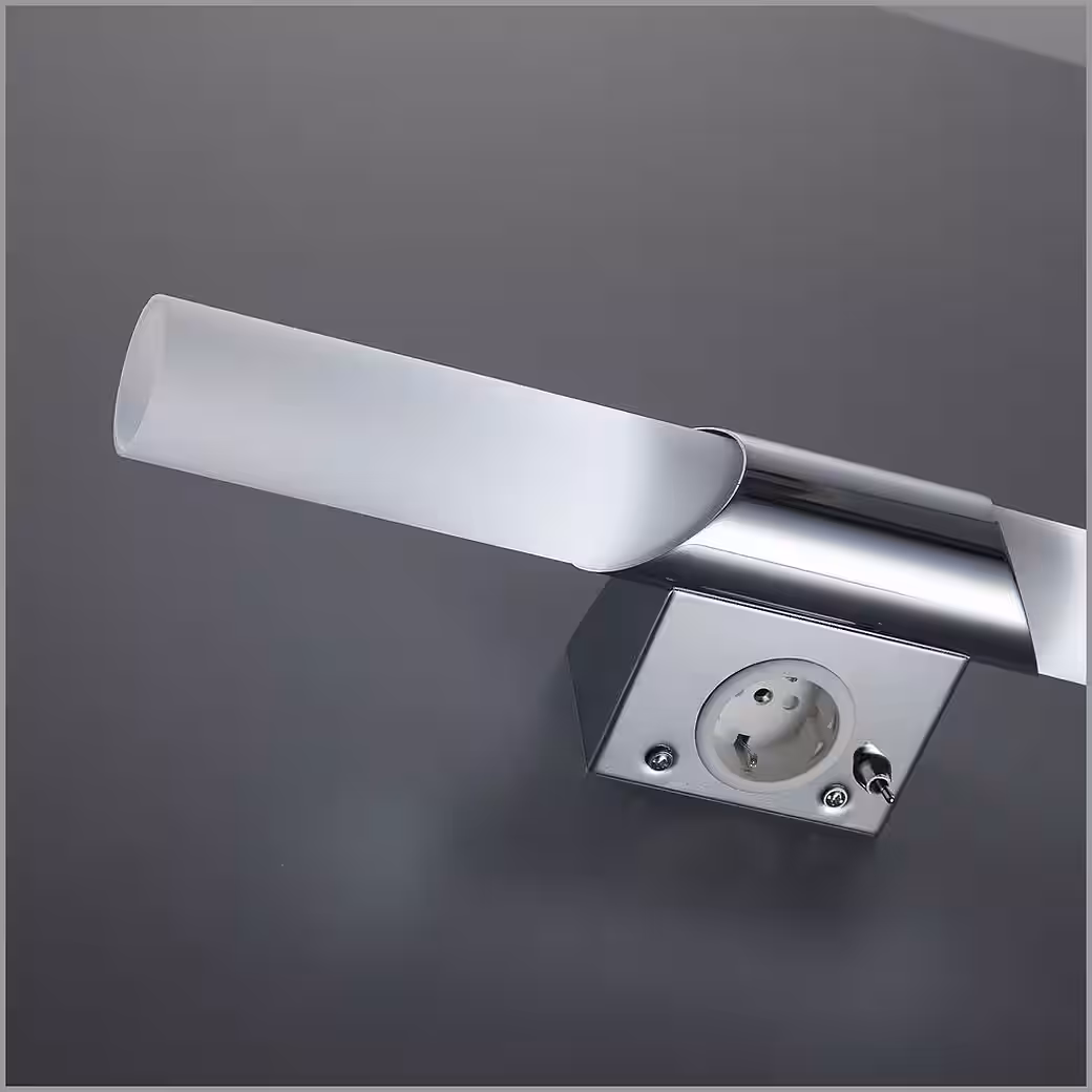 - 1 x LED mirror light with toggle switch and socket, in chrome, incl. 2 x LED, E14 5 Watt bulbs. Dimensions: 44.5 x 11 x 6 cm (W x D x H)