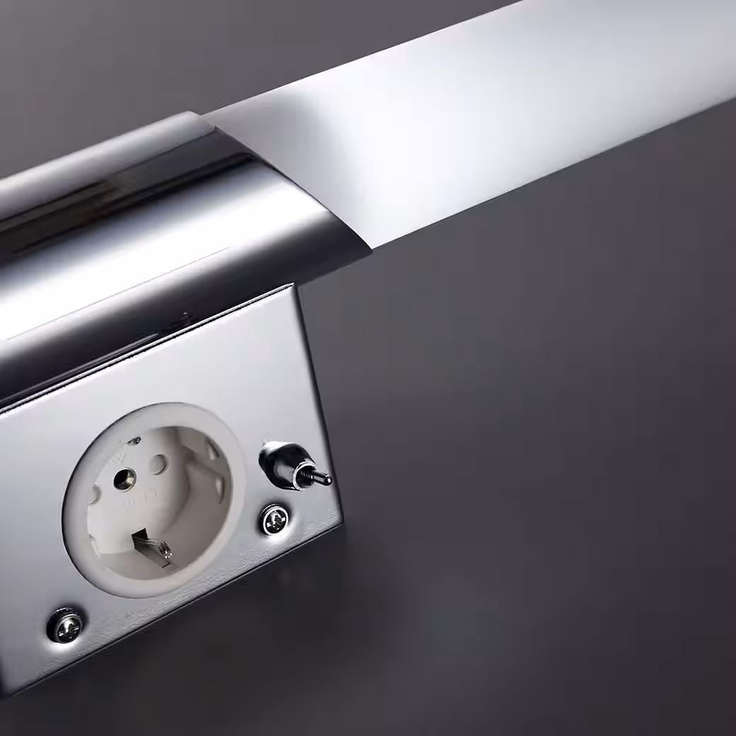This modern light fixture is suitable for both bathrooms and traditional wall lighting. Mithra features an integrated power outlet, making it ideal as a mirror light. The two glass diffusers on the sides (approx. 4.5 cm in diameter) create a soft, warm white light. The light can be switched on using either the toggle switch or the wall switch. It comes complete with E14 LED bulbs.
