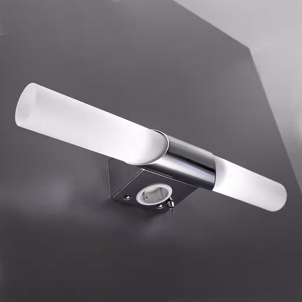 - Durable wall lights for the bathroom made of metal and glass, featuring a toggle switch and an integrated socket.