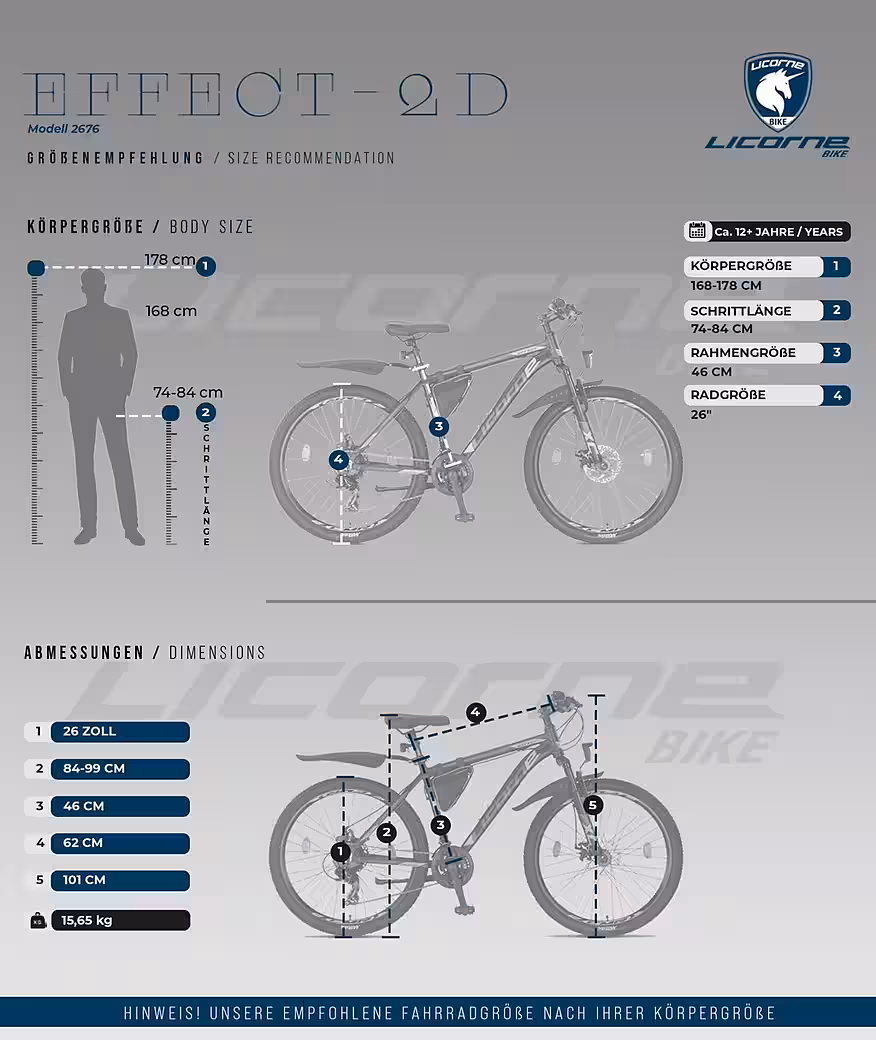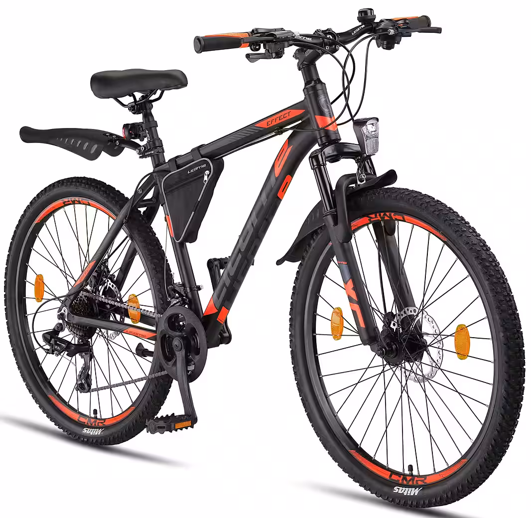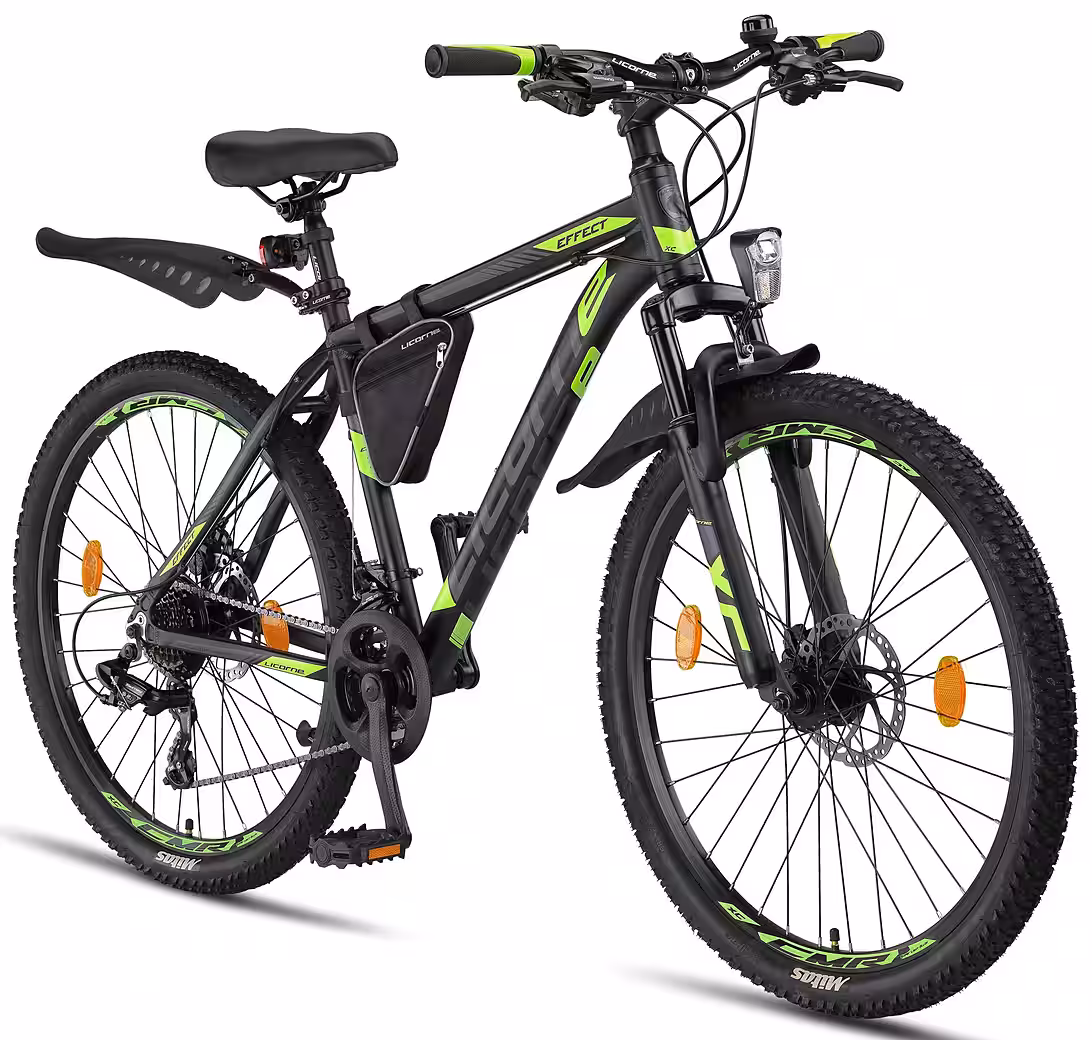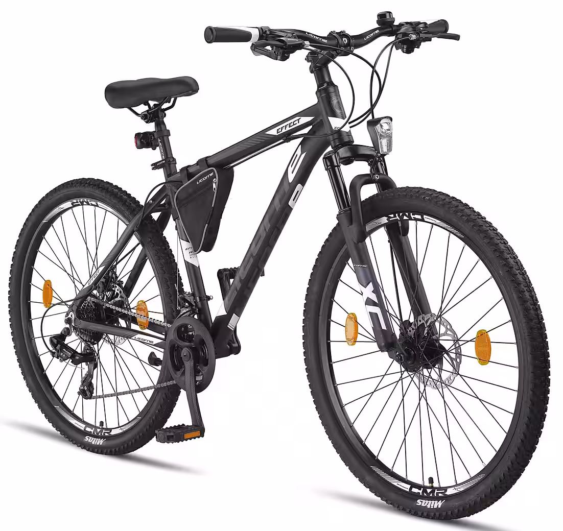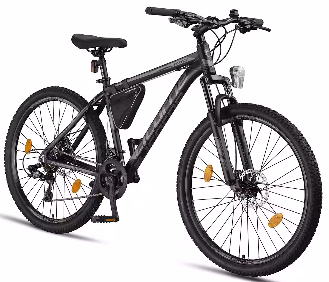 A mountain bike with an aluminum frame and front suspension fork, perfect for those seeking a robust everyday companion for daily use and off-road adventures. The 21-speed derailleur gears offer smooth shifting for all riding conditions. The Effect is an excellent mountain bike at a reasonable price. Equipped with front and rear lights, it complies with German road traffic regulations (StVZO). The bike arrives 85% pre-assembled, with final assembly required by the customer. A frame bag and tools are included. Pedals, handlebars, bell, front light, saddle, and front wheel must be installed by the customer (fenders are not included for 27.5″ and 29″ models). The brakes and gears are pre-installed and require only adjustment. A link to the PDF assembly instructions and an assembly video can be found on the packaging.
