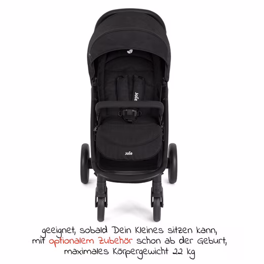 The Joie stroller is a versatile companion for children from 6 months to 4 years old (max. 22 kg). It offers comfort, safety, and flexibility for little explorers. The extendable canopy with sun visor reliably protects against sun, wind, and rain. Thanks to the viewing window and ventilation, you can always keep an eye on your child. The backrest can be adjusted to four positions and the footrest to two – ideal for active and relaxed periods. With the lie-flat function, the stroller transforms into a cozy place to sleep on the go. A 5-point harness and a removable, hinged bumper bar ensure safety and make getting in and out easier.