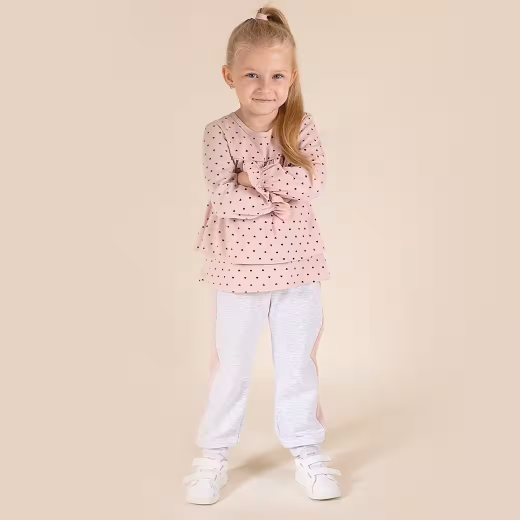 Magical long-sleeved blouse “Ola” in powder pink for girls. This adorable blouse with graphite hearts and long sleeves is not only fashionable but also comfortable to wear. The blouse is decorated with adorable graphite hearts that add a playful touch. Up to size 104, the blouse is attached to the shoulder with a push button, making it easier to put on and take off. The blouse presents an interesting, airy cut that is both comfortable and stylish. The front is decorated with an additional layer of fabric that has been gathered to create an elegant ruffled effect. The sleeves at the bottom also have an elastic band that forms another ruffle.