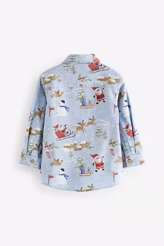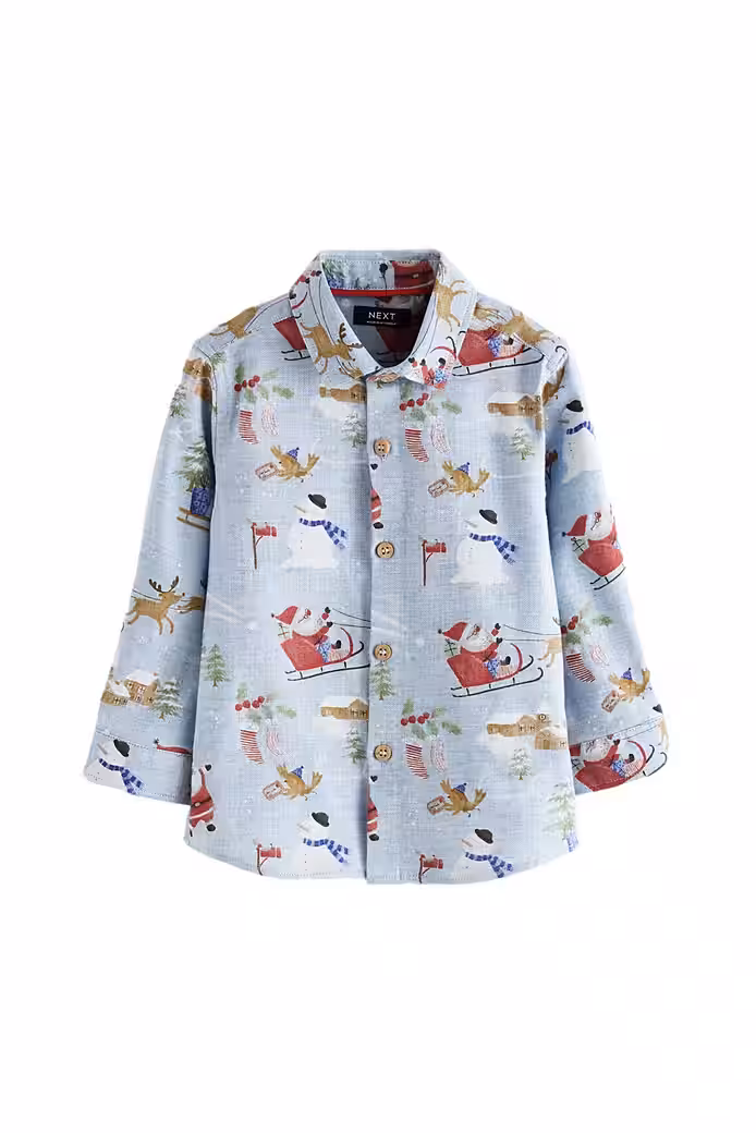 Add a festive touch to your boys’ shirts with our blue long-sleeved Christmas shirt. This pure cotton shirt features a fun print, long sleeves, and a button placket.