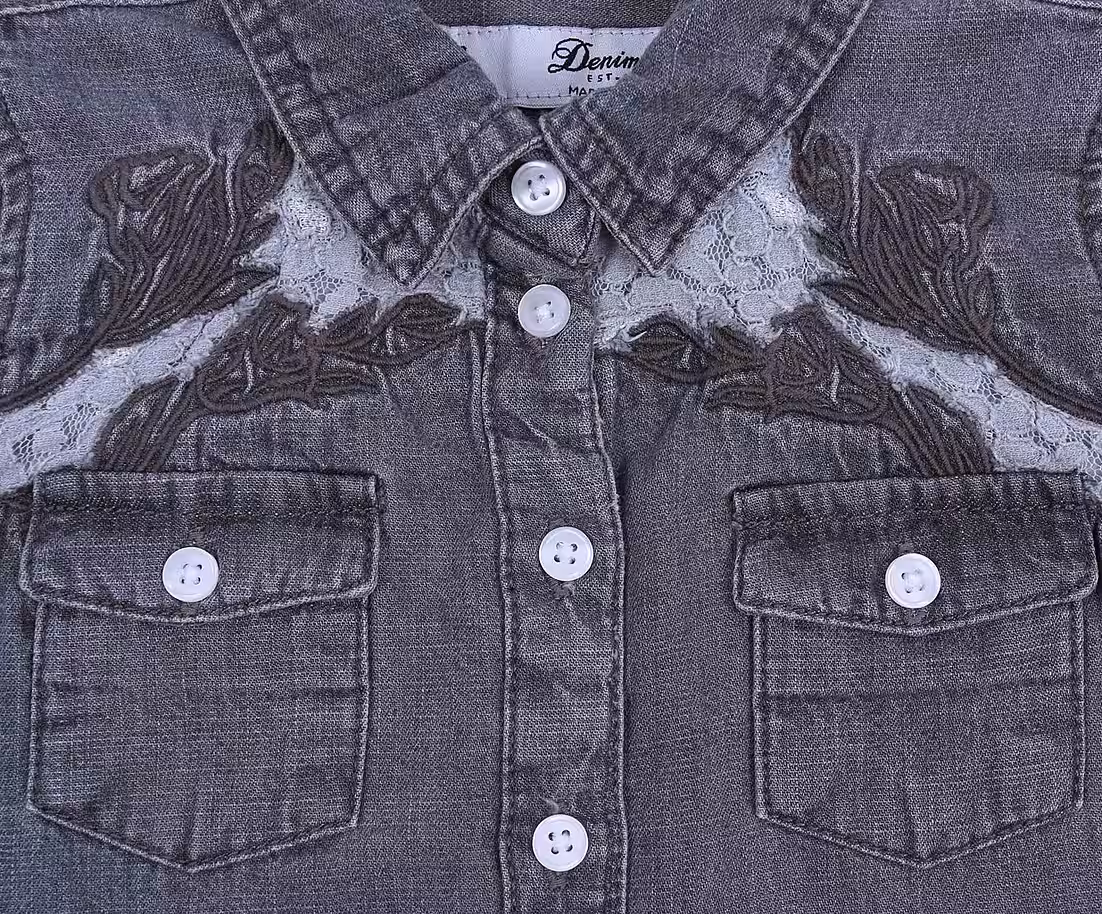 Beautiful grey denim shirt with a collar and buttons. Features lace inserts with flowers and two pockets on the front. Made from a soft, comfortable fabric.Â
