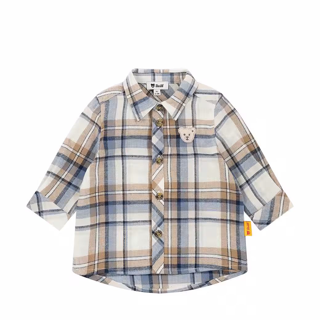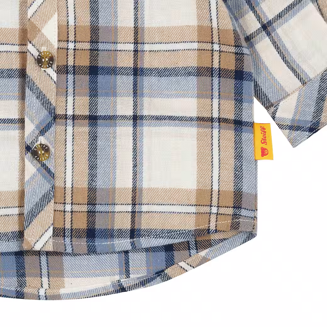 Little charmers will look stylish in this cozy flannel shirt. The classic blue and beige check pattern gives the look a timeless yet modern touch. Thanks to the soft material and comfortable fit with a slightly rounded hem, maximum comfort is guaranteed. The shirt collar and full button placket make dressing a breeze and ensure a classic appearance. The Steiff teddy bear motif on the chest adds a charming accent – ​​a cozy eye-catcher for style-conscious explorers.