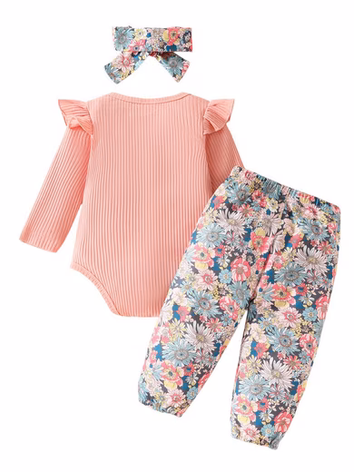 This is a three-piece set for baby girls, consisting of a ribbed lace top with flutter sleeves, floral patterned trousers and a headband.