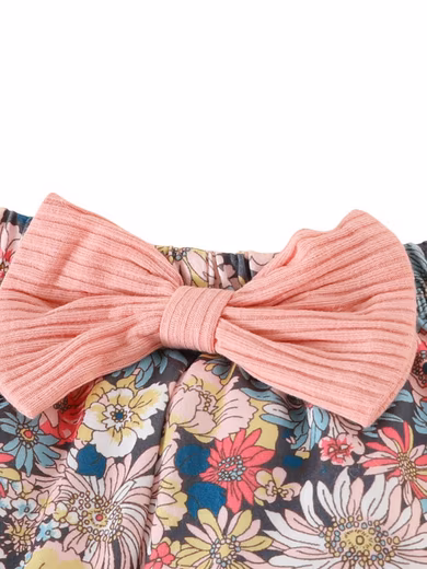The top is made of soft and comfortable ribbed fabric and features lace trim on the chest, giving it a sweet and cute look. The trousers are adorned with large bows and floral patterns, enhancing the overall impression of sophistication. The headband perfectly complements the outfit, making it both beautiful and practical.