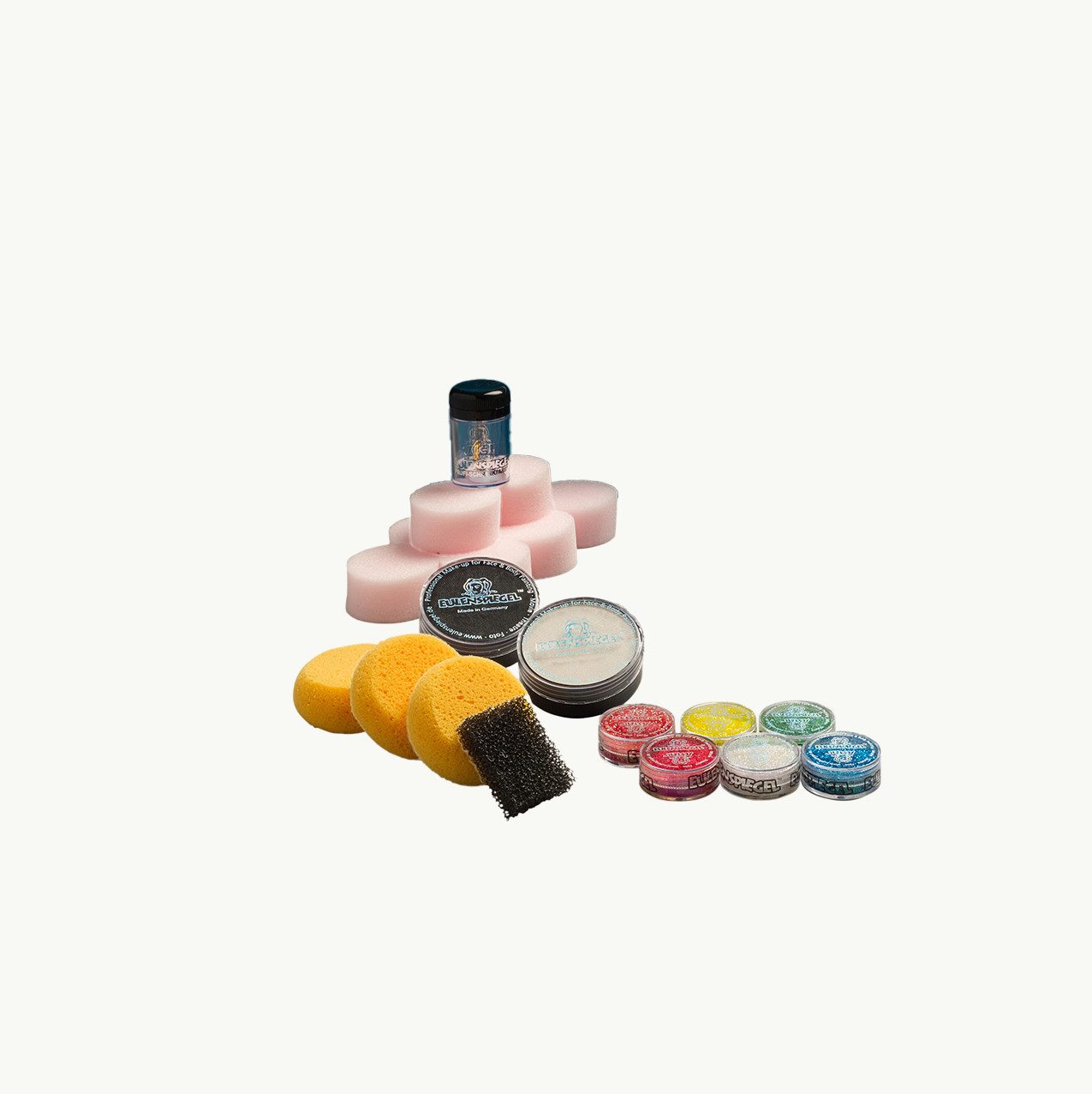 1 professional plastic make-up case (standard), professional aqua make-up 2 x 70 ml: white, black, 12 x 20 ml: royal red, pearlescent orange, fuchsia pink, yellow, brown, turquoise, sky blue, brown, emerald green, pearlescent silver, pearlescent gold, light pink, purple, polyester glitter glamour edition, antibacterial sponges (3-pack), fine-pored sponges (10-pack), beard stubble sponge, brush bag, round brush size 3, cat’s tongue brush size 4, size 8, applicator brush small |
