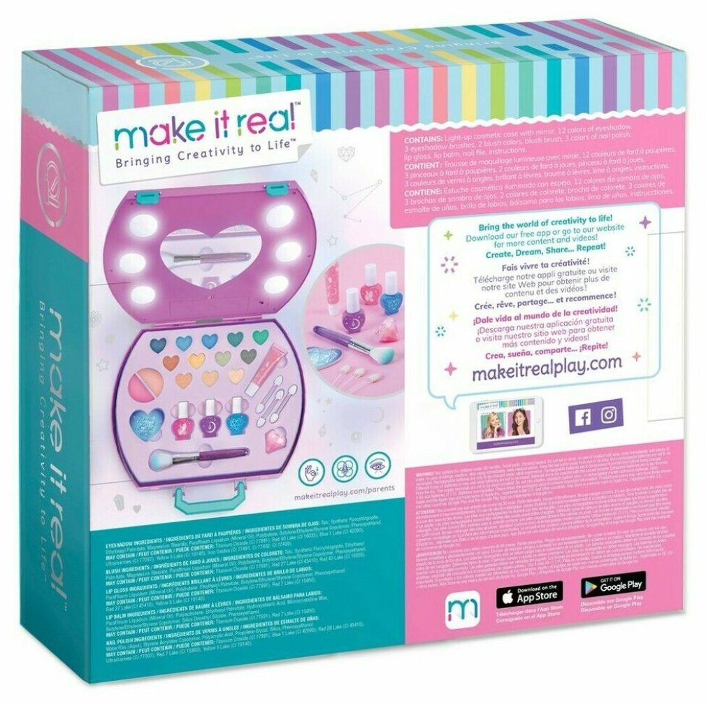 Let your inner makeup artist shine with bold, unique looks created from scratch! Watch your daughter unleash her creativity as she creates stunning makeup looks and experiments with eyeshadow, blush, nail polish, and more! This makeup kit has everything your daughter needs to start her makeup journey. Includes all the essentials for her makeup look, plus a carrying case so she can get creative anywhere! This adorable heart box contains a light-up mirror and tons of makeup for radiant, flawless manicures and matching makeup. Brighten up your makeup bag. This light-up makeup case is the perfect starter kit for tweens to experiment with makeup looks and get creative! Includes all the essentials needed for the perfect manicure to complete your look ? Helps kids develop hands-on skills. The Light-Up Cosmetic Kit helps young girls develop fine motor skills, visual skills, and self-expression skills—all while having fun, unleashing their creativity and self-expression! • Everything is included. This makeup set has everything your little one needs to look great! Includes 12 colors eyeshadow, 3 colors nail polish, blush, lip gloss, nail file, makeup brush… a perfect gift. The “Make It Real” educational toy is a great gift for girls and teens, helping them develop the skills that will make them leaders and creators of tomorrow—for ages 8 and up. All ingredients are non-toxic and wash easily off skin and clothing. Set includes: 12 eyeshadow colors 3 nail polish colors Blush Lip gloss Nail file Makeup brush ATTENTION: NO. Suitable for Suitable for children under 36 months.