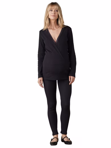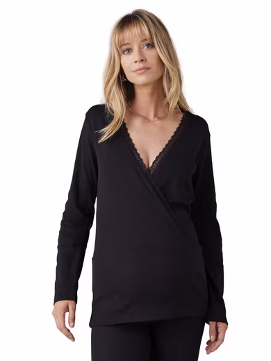 babywearing top: The baby is carried skin-to-skin in a vertical position. Wide, internal straps sewn into the shoulder area for the baby. Breastfeeding opening. Crossover neckline with lace trim. Long sleeves.