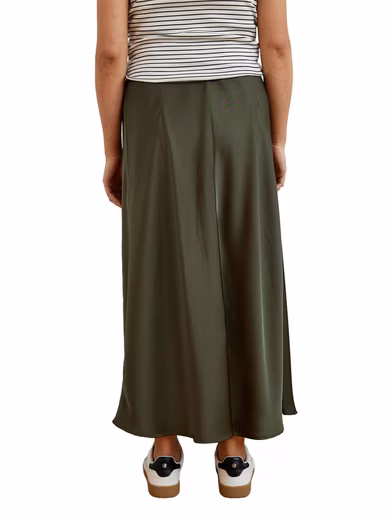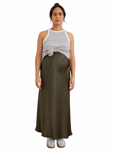 - The elegantly shiny, flowing satin skirt is a feminine favourite for going out – with or without a baby bump!