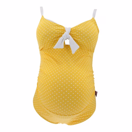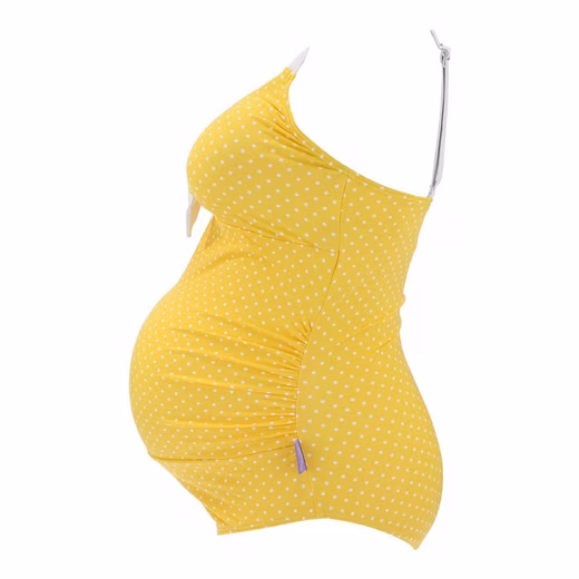 Fresh, cheerful design in sunny yellow with white dots, contrasting with delicate white details, this maternity swimsuit makes the desire to stroll and the anticipation of the baby perfect: Equipped with removable padding and a very soft, elastic support of the chest inside as an all-round bustier, this maternity swimwear enjoys great popularity! Adjustable straps at the back and the gathering through the bow at the front offer a high level of comfort. Skilful ruffles flatter every curve, not just that of the baby belly. To make you feel completely safe while bathing, this maternity swimwear is opaque even when wet thanks to the second soft layer with which it is lined. And even better: Our maternity swimwear is so cleverly cut that it fits well and grows with the child, not only during pregnancy. All models of the Petit Amour maternity swimwear also fit perfectly for non-pregnant women and are becoming more and more popular. Maternity swimwear swimsuit for pregnant women ANTONIE_gelb: Our sizes S-XXL are based on the following ready-to-wear and cup sizes BEFORE pregnancy. Please note that we have already taken into account the changes in the figure during pregnancy in our size calculation and that you should not order a size larger. Clothing size: 36/38 with cup B C = S petit amour maternity swimwear Clothing size: 38/40 with cup B C = M petit amour maternity swimwear Clothing size: 40/42 with cup B C = L petit amour maternity swimwear Clothing size: 42/44 with cup B C = XL petit amour maternity swimwear