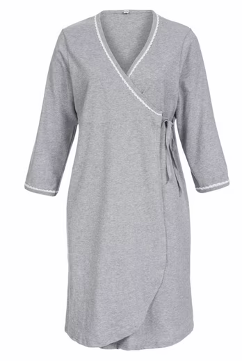 Our perfect maternity wear is a great help both as loungewear and as a nightgown for pregnant women, as well as a maternity nightgown and tunic for childbirth. At the same time, it is a maternity dress for changing and a birth and nursing dress for everyday life with a baby. As a maternity jacket for the home, it is also a nursing shirt and is often recommended by midwives in combination with the matching maternity trousers. It is the optimal clothing during pregnancy, childbirth and in the clinic and for breastfeeding at home. It is perfectly cut for breastfeeding and over the nursing bra, as the fabric of the nursing fashion can simply be pushed to the side and the mom still stays nicely dressed. With its beautiful wrapping technique, the pleasantly soft and pleasing material and the uncomplicated look in sporty grey, you are optimally equipped and dressed with the maternity tunic during pregnancy and especially for childbirth and during breastfeeding. The GINA maternity trousers, made of the same material, go perfectly with it. So you are ideally dressed in all circumstances.