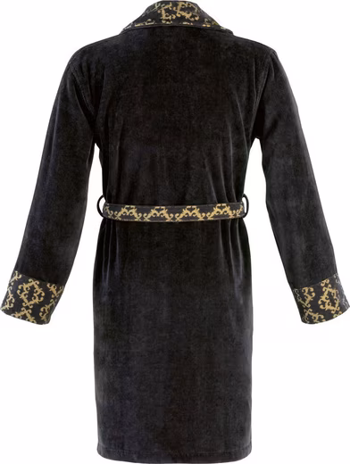 - PREMIUM – This stylish black bathrobe from Carlo Colucci is an absolute eye-catcher thanks to its golden velour jacquard details on the sleeves, collar and belt.