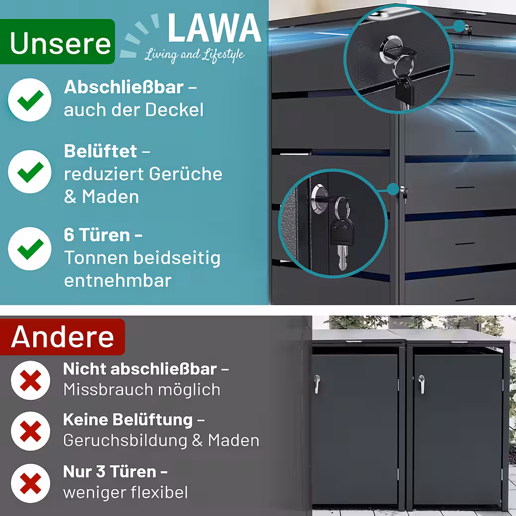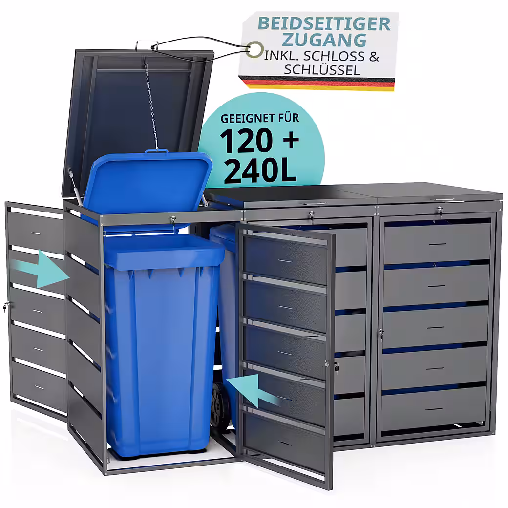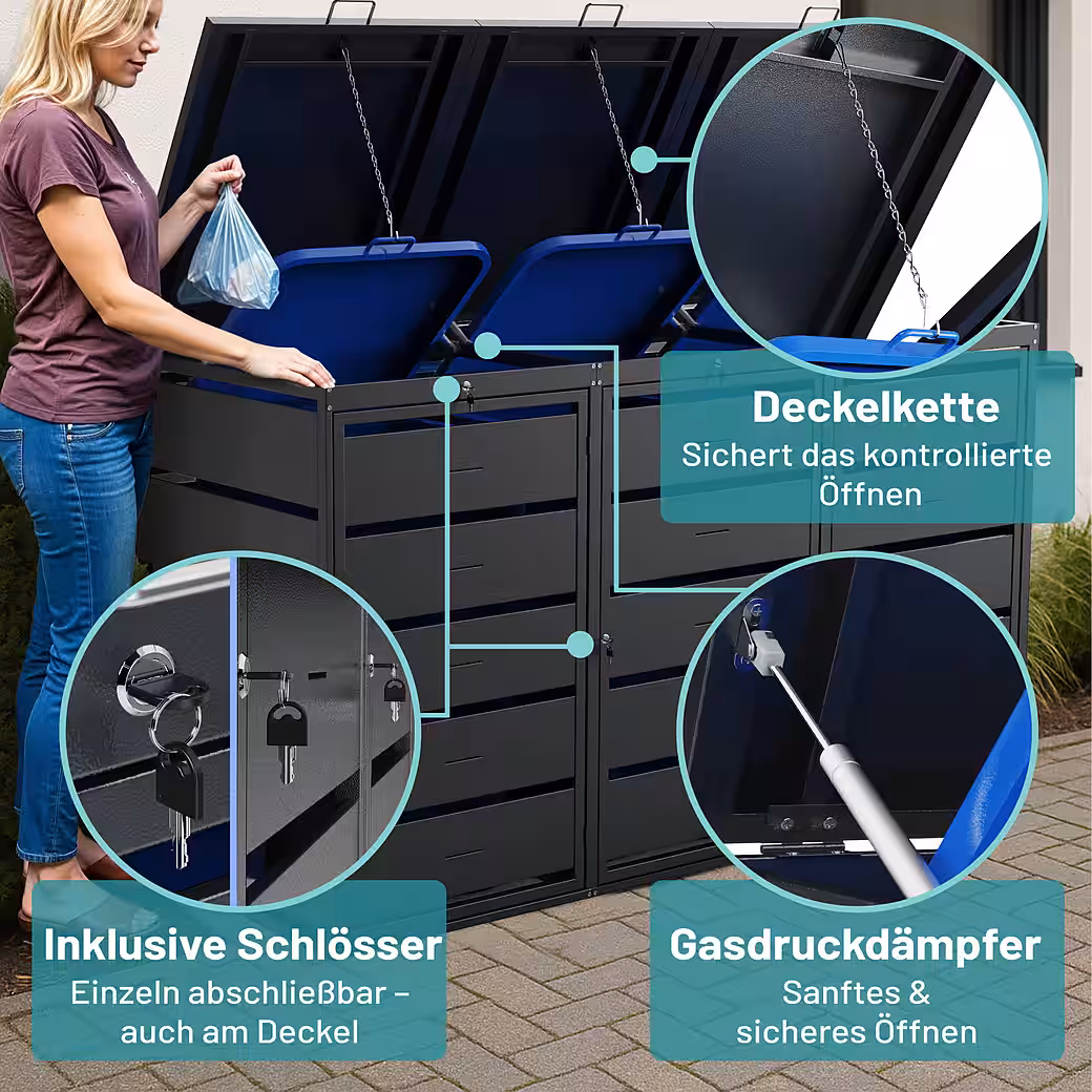 - The individually lockable doors and lids ensure security and order. No more fines for improperly disposed of waste due to unauthorized access.