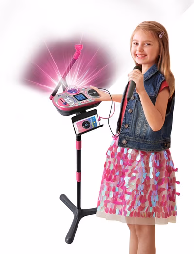 With the “Kidi Super Star DJ Studio, pink” from Vtech, everyone can become a superstar. Simply become a DJ and mix your own music, as well as add sound effects or vocals. Twelve songs with cool animations on the display are already pre-installed. Of course, you can also connect your own favorite songs via an external music player and start the concert in your child’s room. Thanks to the voice reduction function, the vocals can be reduced or removed from all pre-installed and most external songs. You can also easily record your performances using the recording function. Other highlights include: cool voice distortion effects, various sound effects, crowd effects, disco lights, a built-in speaker, and four games. The height-adjustable “Kidi Super Star DJ Studio, pink” from Vtech is perfect for all little superstars aged 6 and up.