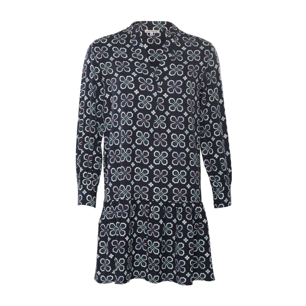 Women’s Dress “SOLENNE”: ‘Solenne’ captivates with its feminine charm and is made from sustainable 100% ECOVERO viscose. The lightweight twill fabric with its delicate print flows elegantly around the figure, while the narrow stand-up collar and pleated V-neck give the design a modern touch. The flounce at the hem, the cuffed sleeves, and the corozo buttons perfectly round off the dress.