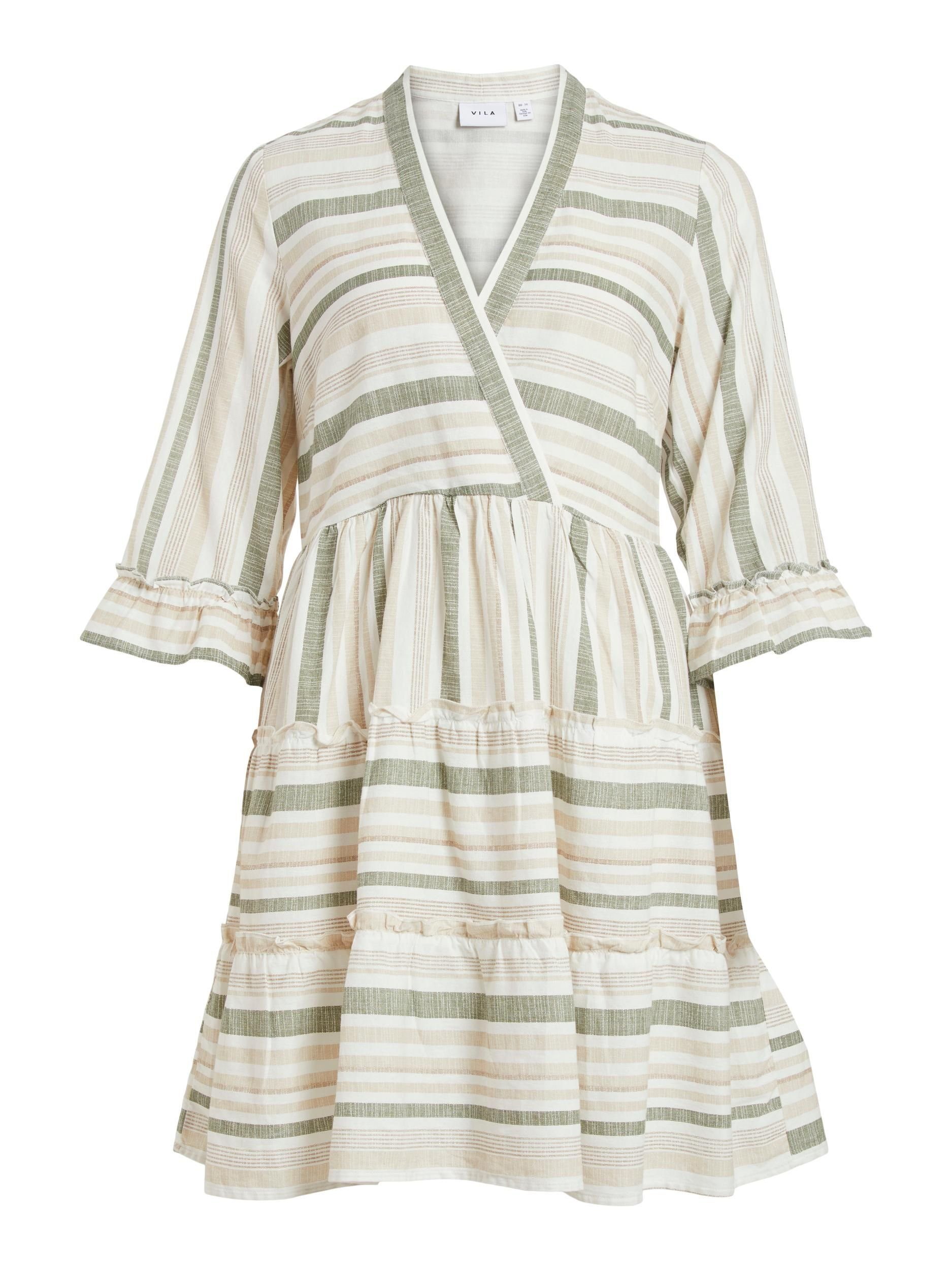 – Striped dress with 3/4 sleeves – Ruffles on the skirt and sleeves – Wrap-effect on the top – Length: 95 cm in size 38 – Sleeve length: 44 cm in size 38 – Our model is 178 cm tall and wears size 38