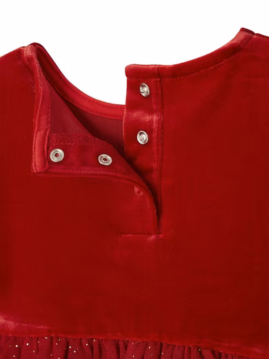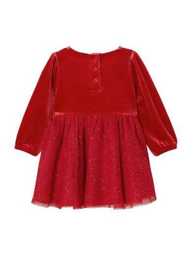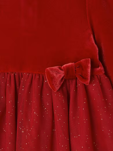 Dress: Velvet top. Round neckline. Snap closure at the back. Decorative bow at the front. Long sleeves with fitted cuffs. Tulle skirt with glitter effect.