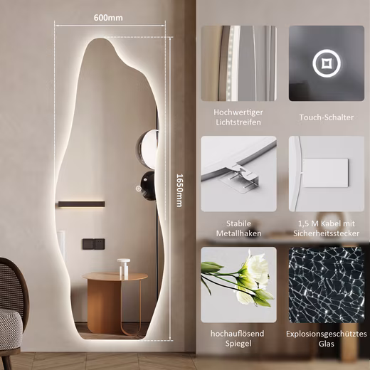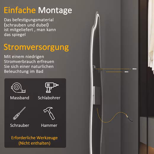 • Scope of delivery: 1x LED full-length mirror (without bracket) with 1.5m power plug, 1x mounting set, 1x instructions. It is not battery-operated.