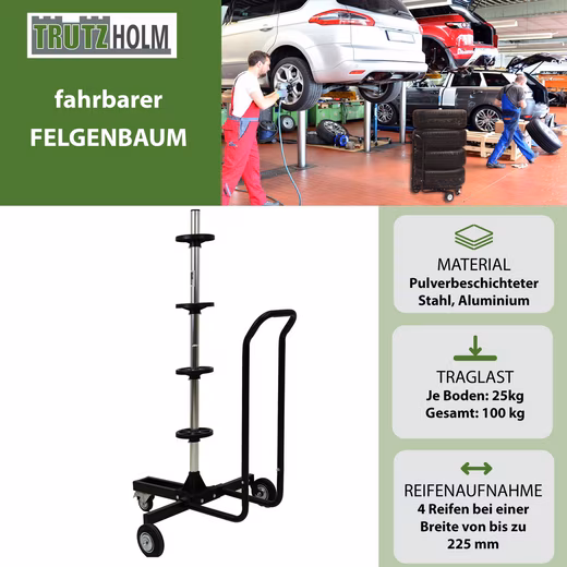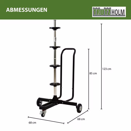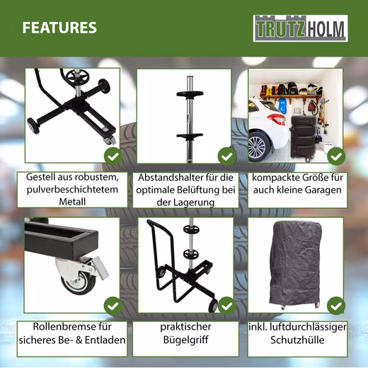Characteristics Very handy thanks to the front swivel caster; front wheel with locking brake to prevent unintentional rolling; smooth-running thanks to 3 large rubber-tired wheels with steel rims; sturdy material: 30 x 30 mm steel frame, black powder-coated; supports up to 4 car tires up to 225 mm wide; secure stand; tire and rim-protecting ABS plastic contact surfaces; free-floating storage; no tire deformation due to pressure loss
