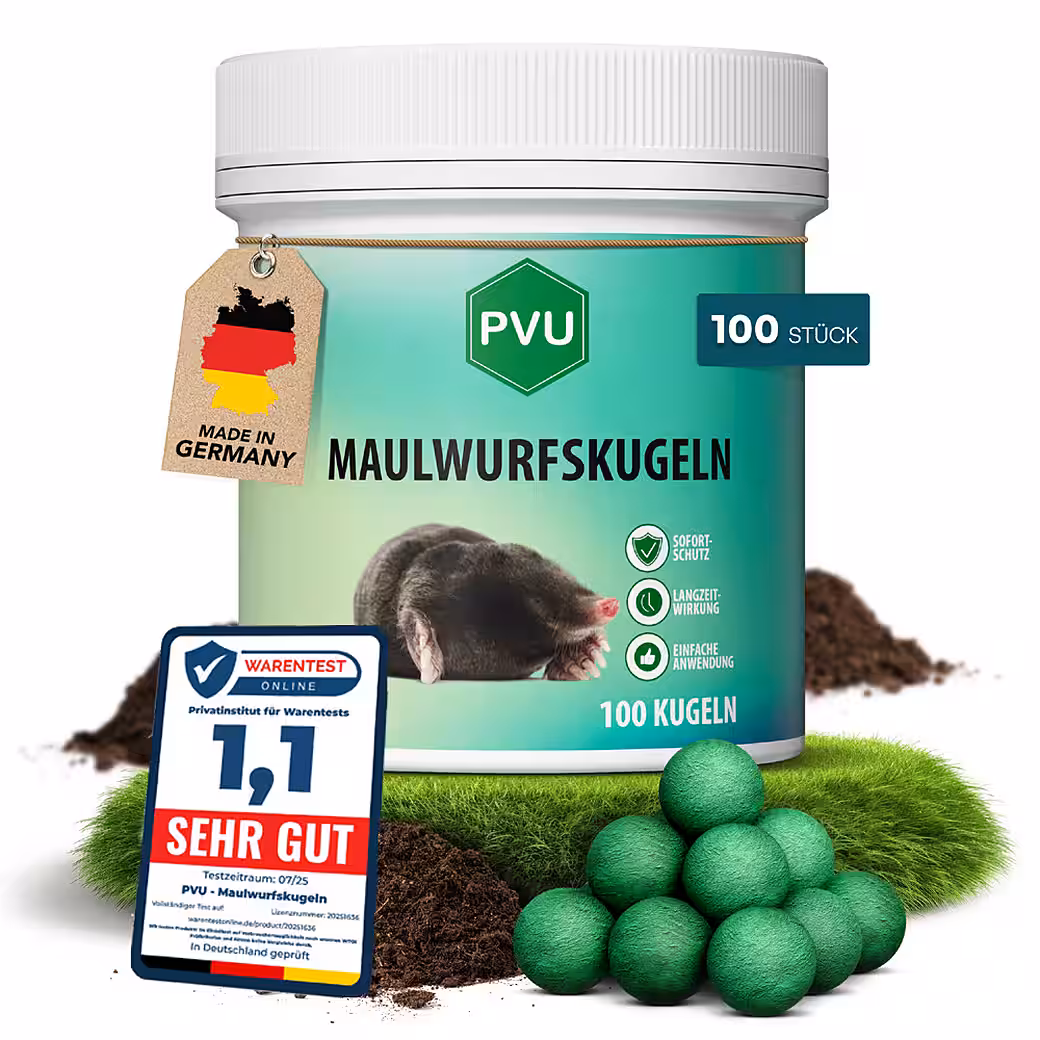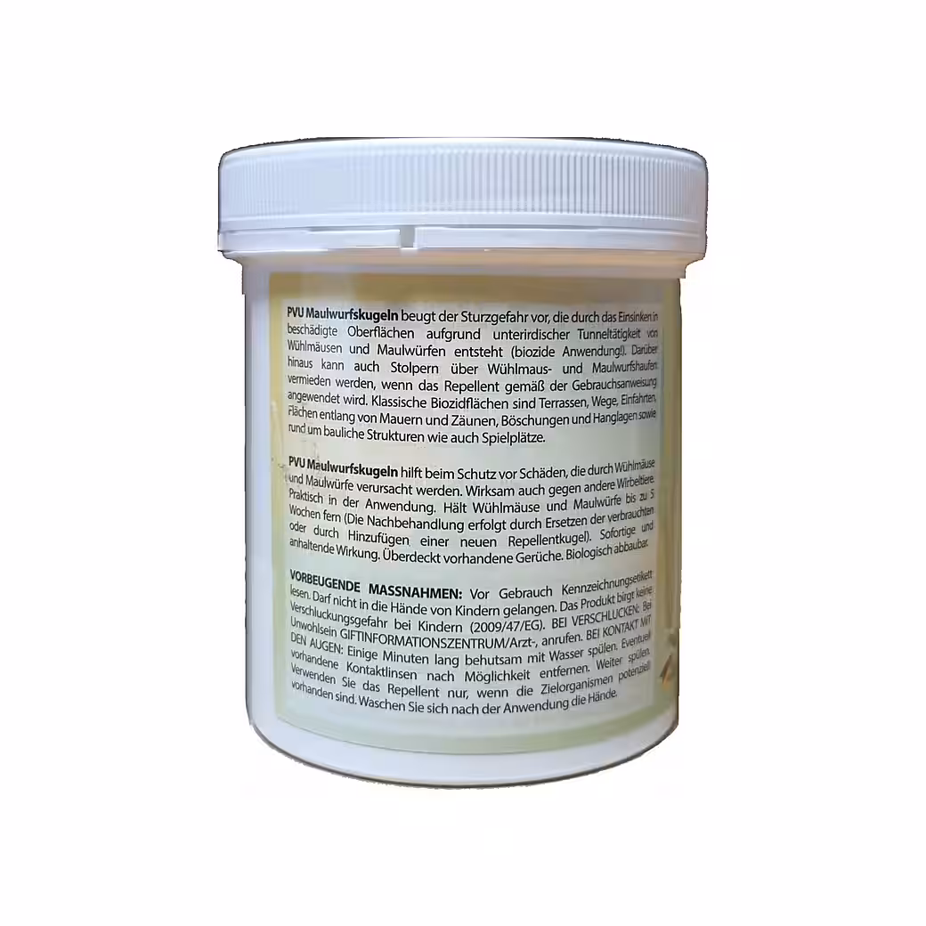 “PVU Mole Balls – Mole Repellent – Immediate & Long-Term Effect – Eucalyptus Lemon Scent – Effective Mole Control Agent – Biodegradable Balls, 100 Pieces. IMMEDIATELY CONTROL MOLES: Enjoy a garden free of pesky moles! Our PVU Mole Balls provide immediate and effective protection, preventing pests from damaging your beautiful lawn and plants. RELIABLE PROTECTION WITH LONG-TERM EFFECT: Protect your garden paradise for up to 5 weeks! Our powerful Mole Balls work reliably, giving you peace of mind that moles are kept away – for a well-maintained and safe garden environment. Distribute additional balls during heavy rain. EASY APPLICATION FOR EVERY GARDEN: No more complicated solutions! Simply place the balls at a depth of 20-25 cm along your garden paths. One Mole Ball every 2-3 meters.” is ideal for creating an effective barrier. Then move 1-2 meters further and repeat the process to increase the deterrent effect. With these simple step-by-step instructions, you can effortlessly apply the balls in critical areas such as patios, paths, and playgrounds. NATURAL FORMULA FOR A GREEN GARDEN: Trust in the power of Eucalyptus citriodora oil. Our environmentally friendly mole balls are biodegradable and offer a natural solution that is not only effective but also safe for your plants and pets. Our PVU mole balls are manufactured in Germany to the highest quality standards. BauA Reg. No.: N-113748. Keep your garden in top condition! PRECAUTIONARY MEASURES: Read the label before use. Keep out of reach of children. The product does not pose a choking hazard for children (2009/47/EC). IF SWALLOWED: If you feel unwell Call a POISON CENTER/doctor. IF IN EYES: Rinse cautiously with water for several minutes. Remove contact lenses, if present and easy to do. Continue rinsing. Use repellent only if the target organisms are potentially present. Wash hands after use. FORMULATION / CONCENTRATION / ACTIVE INGREDIENT / DOSAGE AND AMOUNT: Balls with impregnating solution for protecting areas at risk of being trampled; 50 g/l Eucalyptus citriodora oil, hydrated, cyclized (EC Oil (H/C)); 1 repellent ball for each side of the open mole tunnel every 2-3 m in length. Contains 2-hydroxy-alpha, alpha, 4-trimethylcyclohexanemethanol, citronellol, cineole. May produce an allergic reaction. See inside label for further instructions for use. Composition: Active ingredient: Lemon eucalyptus oil, hydrated, cyclized. BauA Reg. No.: N-113748. USE BIOCIDAL PRODUCTS SAFELY. ALWAYS READ THE LABEL AND PRODUCT INFORMATION BEFORE USE.