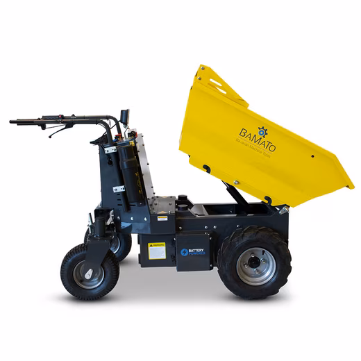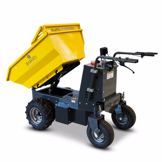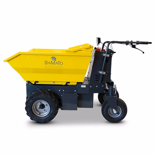 The BAMATO Mini Transporter MTR-500REPRO is the perfect companion for anyone looking for powerful performance in a compact design. With its electric drive, it ensures environmentally friendly and quiet work. The tipping hydraulics allow you to transport and unload heavy loads with ease. Equipped with large pneumatic tyres and a field stud tread, this dumper effortlessly masters almost any terrain. The steering wheels, which can be moved in all directions and are mounted on a pendulum axle, enable simple and precise control.