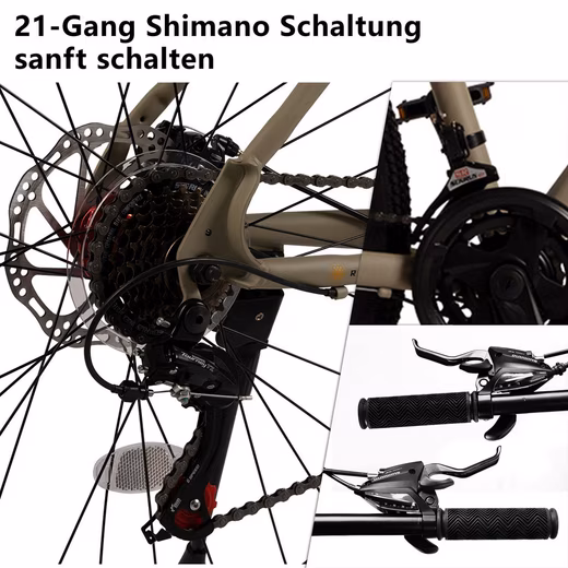 • EXCELLENT EQUIPMENT: With a 21-speed Shimano TZ rear derailleur, the gears can be shifted almost seamlessly, giving you a wide choice for every gradient.