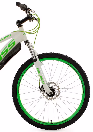 Off to the adventure of mountain biking: With this fully from KS Cycling! The full-suspension 26 inch mountain bike comes all in white with attachments, rims and decals in bright green. The splash guard and saddle are also fully matched to the design. This awesome look is the center of attention everywhere! The bike is equipped with a SHIMANO 21-speed drivetrain, which is conveniently operated via SRAM rotary shifters. Thanks to the full-suspension frame, you always stay in control, even on bumpy roads. Two Scheibenbremsen.br ensure safe deceleration in every situation