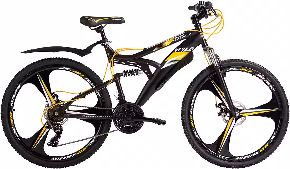 WOW! Let the mountain biking adventure begin: with the 26″ WYLD full-suspension MTB BLISS 3.0, you’ll be the center of attention wherever you go! This new edition of our absolute bestseller comes all in black with yellow decals and cables. Mudguards and saddle are also perfectly coordinated with the design.