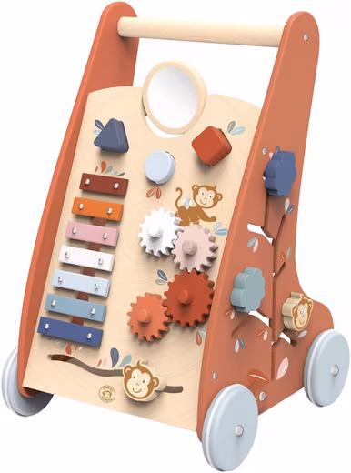This wooden activity walker helps young children develop confidence and balance while walking. It includes nine toys, such as a shape sorter, a rotating mirror, spinning gears, and many other fun learning toys. Your toddler can store their favorite toys in the back of the walker. It encourages imaginative play. For their safety, the rubber wheels are quiet and non-slip. This toy is made from wood sourced from FSCĀ®-certified forests and coated with paint.