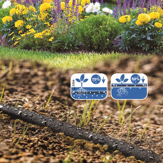 - Controlled, drop-by-drop water delivery of 5-10 L/minute along the drip hose: saves 70% of the water compared to conventional irrigation methods.