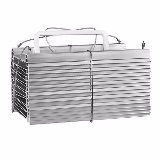 Fire escape ladder, a fire-resistant folding ladder made of steel cable and aluminum rungs. Quickly and easily deployable with a solid steel hook for attaching to, for example, a KF wall anchor. Version A features spacers on the rungs for descending smooth facades (along a house wall). The spacers keep the rungs away from the wall. 12m length. Suitable for 4 stories. Weight approx. 8kg. Dimensions: 330 x 200 x 190mm (folded).